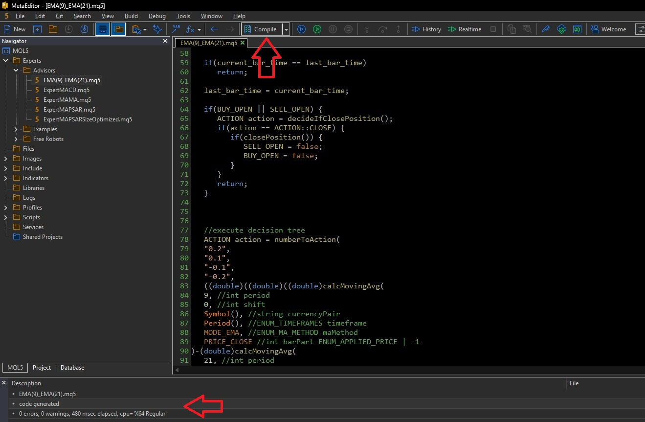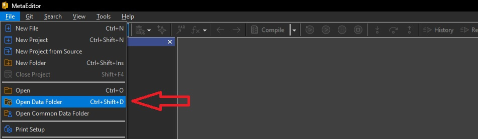 - Open MetaEditor, and select File > Open Data Folder, then navigate to the Expert Advisors folder (MQL5 > Experts > Advisors)