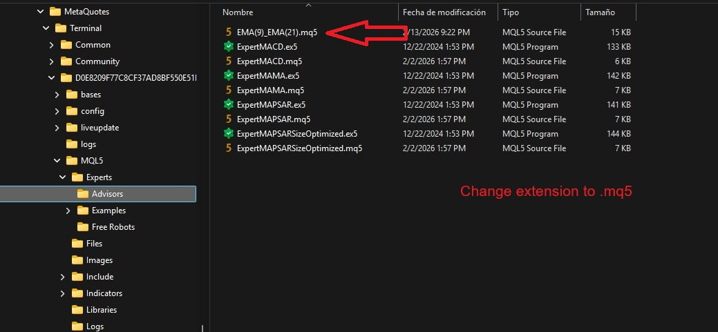 - Save the file to the Expert Advisors folder, change the extension to .mq5