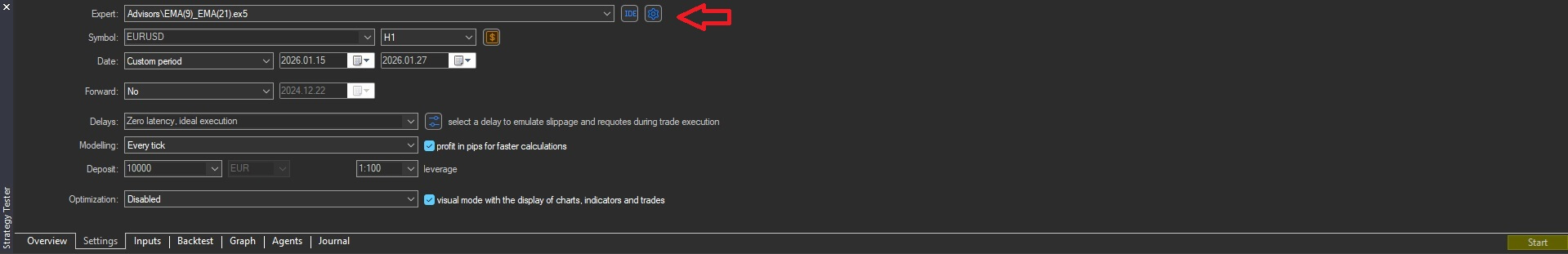 - Configure the backtest in the Strategy Tester panel: Select the Expert Advisor, set the desired parameters (Symbol, Timeframe, Date Range etc), and click Start