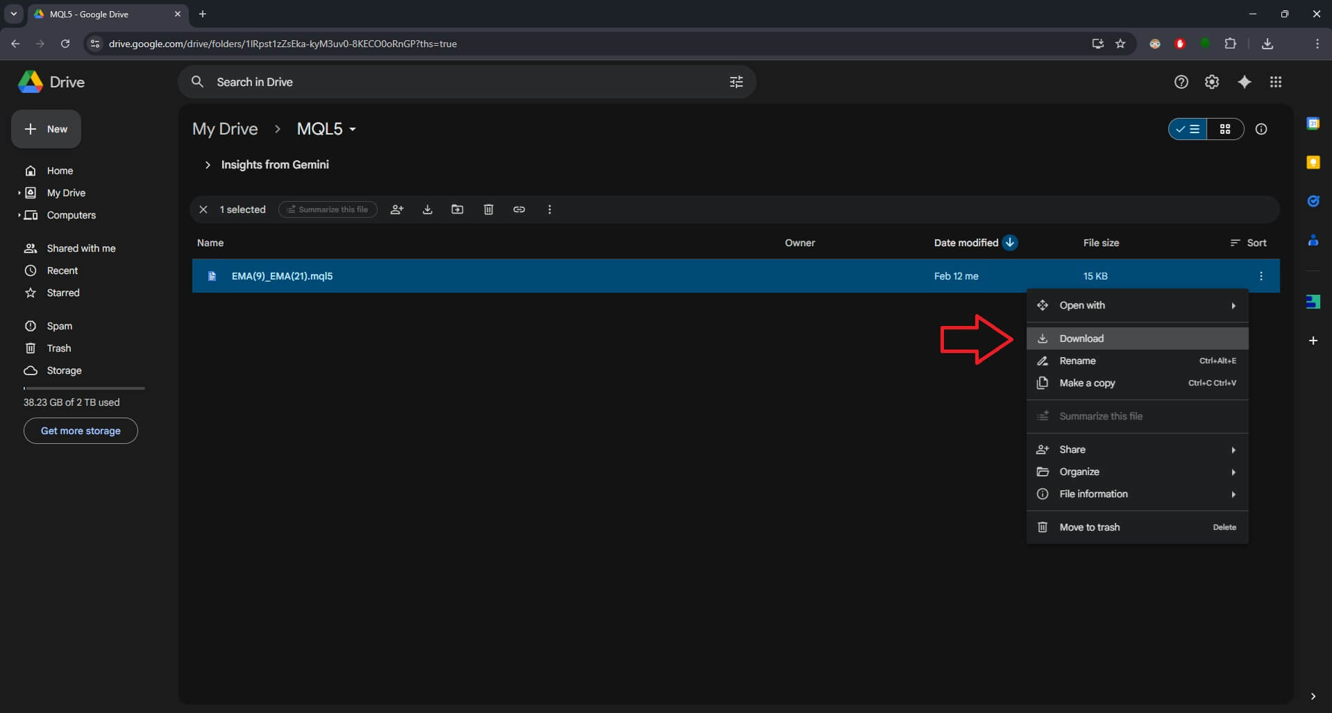 Download the MQL5 from the sharing service to your PC; in this example, we download the file from Google Drive